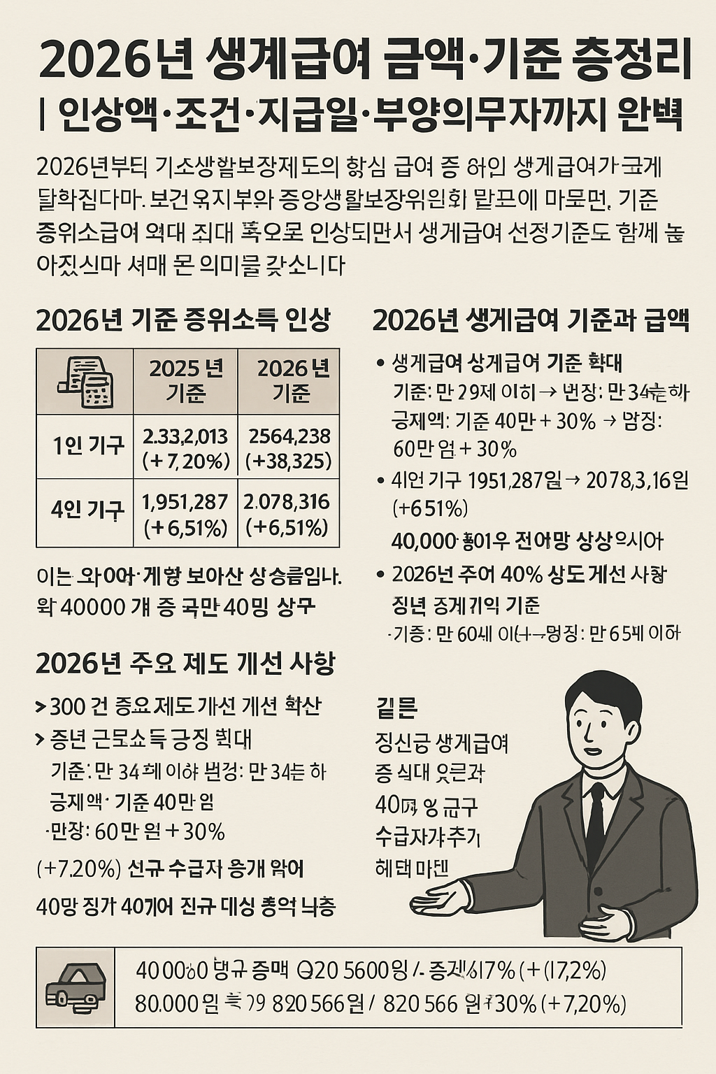 2026년부터 기초생활보장제도의 핵심 급여 중 하나인 생계급여가 크게 달라집니다. 보건복지부와 중앙생활보장위원회 발표에 따르면, 기준 중위소득이 역대 최대 폭으로 인상되면서 생계급여 선정기준도 함께 높아졌습니다. 이번 변화는 저소득층 가구의 생활 안정과 복지 사각지대 해소에 큰 의미를 갖습니다.