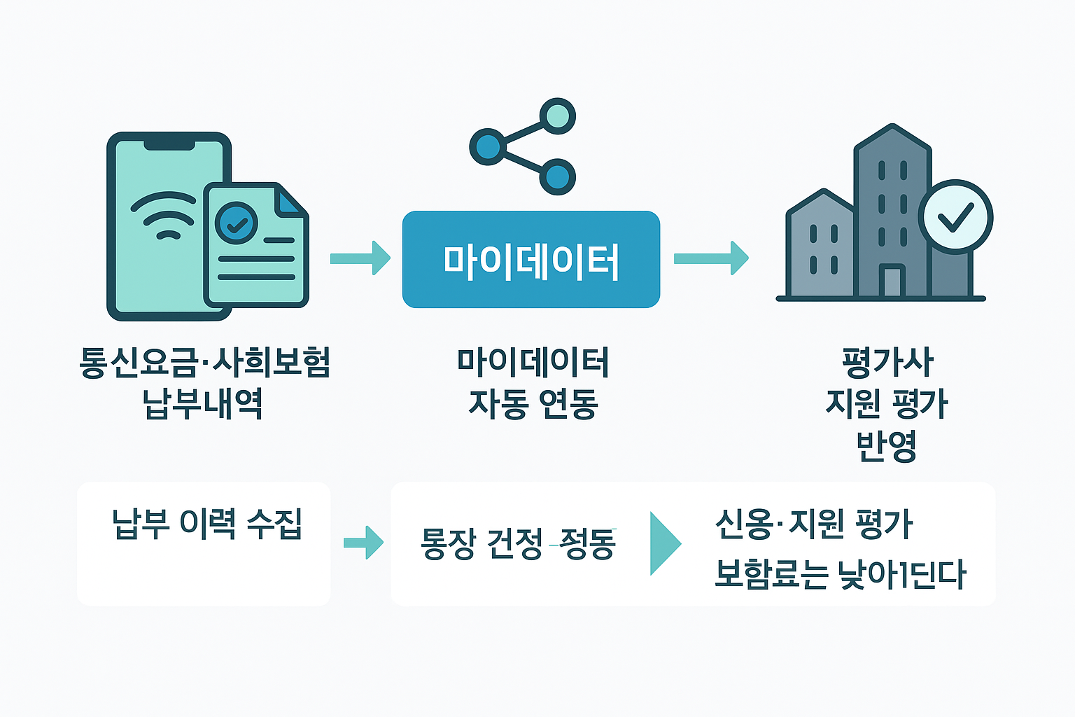 2025년 금융위원회는 ‘비금융정보 기반 신용평가 서비스’를 혁신금융서비스로 지정했습니다. 통신요금, 국민연금, 건강보험 등 성실납부 내역을 신용평가에 반영할 수 있습니다. 평가사 홈페이지나 마이데이터 앱에서 납부 정보를 연동하면 자동으로 가점이 적용됩니다.