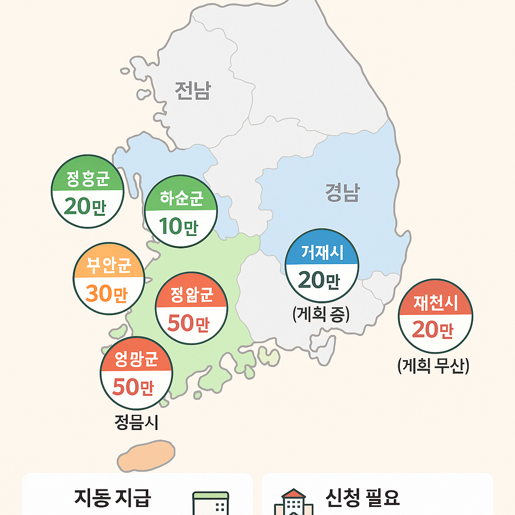 - 신청 필요: 일반 주민은 주민센터 방문, 정부24, 복지로, 또는 지역화폐 앱(예: 전남행복지역화폐)으로 신청.