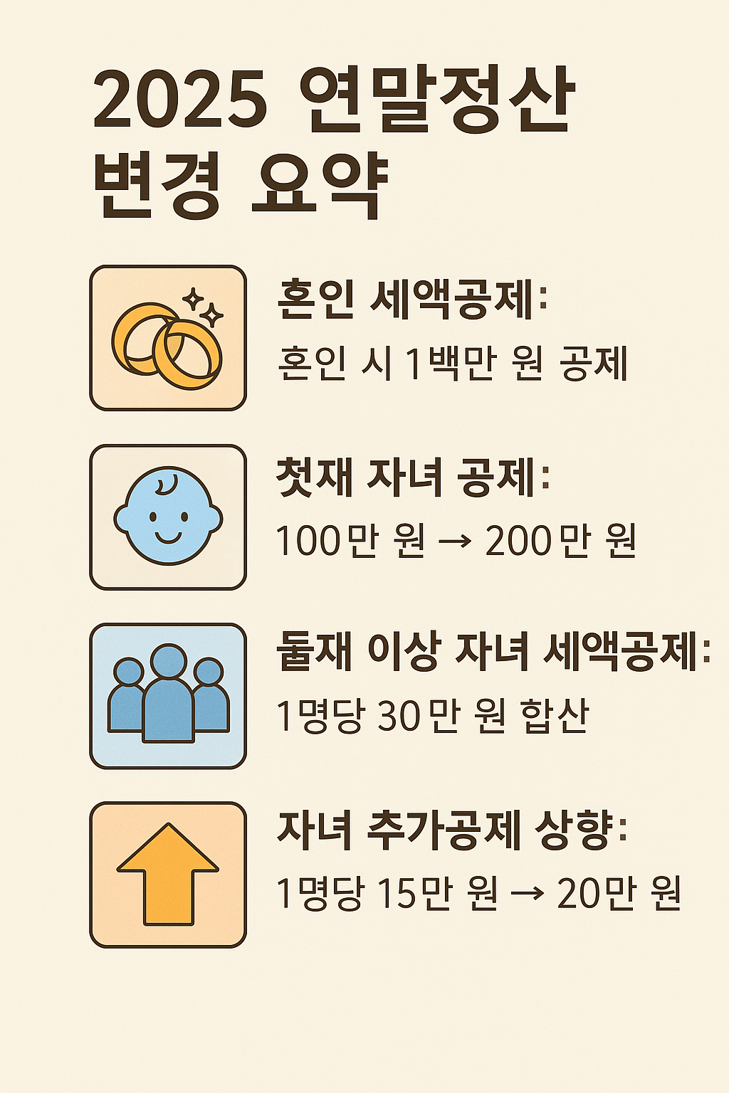 2025년 연말정산은 결혼·자녀·주거 관련 공제 강화와 의료비·기부금 지원 확대가 핵심입니다. 이번 세법 개정은 근로자와 서민층의 실질적인 세부담 완화를 목표로 하고 있으며, 특히 신혼부부, 다자녀 가구, 무주택 근로자에게 유리하게 적용됩니다.