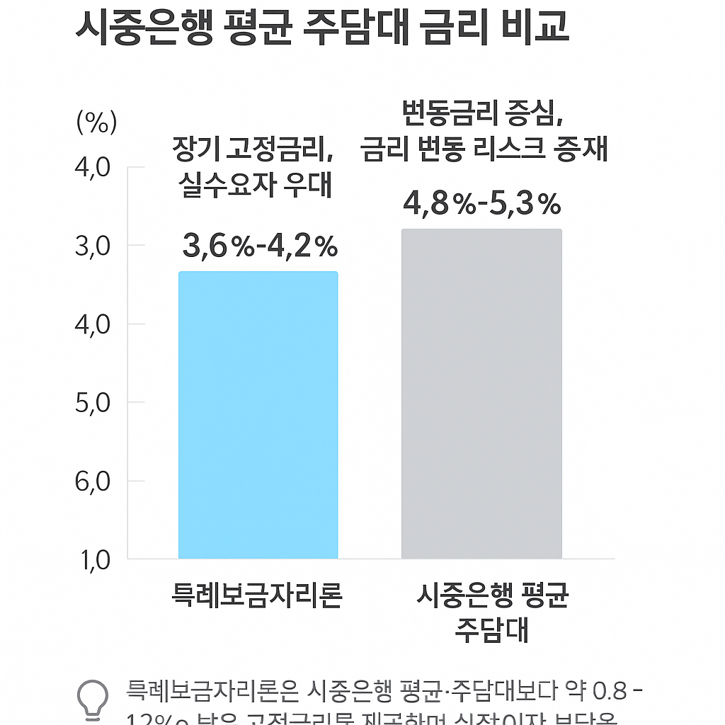 특례보금자리론은 시중은행 변동금리(5%대)보다 낮은 고정금리를 제공하며, 청년·신혼·다자녀 가구에는 추가 금리 인하 혜택이 적용됩니다. 또한 중도상환수수료가 낮아 조기상환 부담이 적습니다.