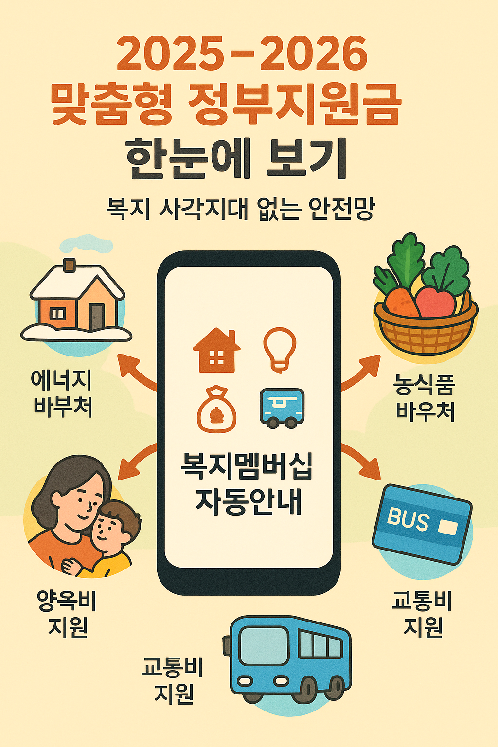 2025~2026년 확정된 정부지원금·바우처 정책은 복지멤버십을 축으로 정보를 연결하고, 에너지바우처·농식품 바우처 등 생활형 지원을 강화하여 사각지대를 줄이는 데 초점이 맞춰져 있습니다. 이용자 관점에서는 복지멤버십 가입 → 알림 수신 → 자격 확인 → 기간 내 신청의 순서만 지켜도 상당수 혜택을 제때 누릴 수 있습니다.