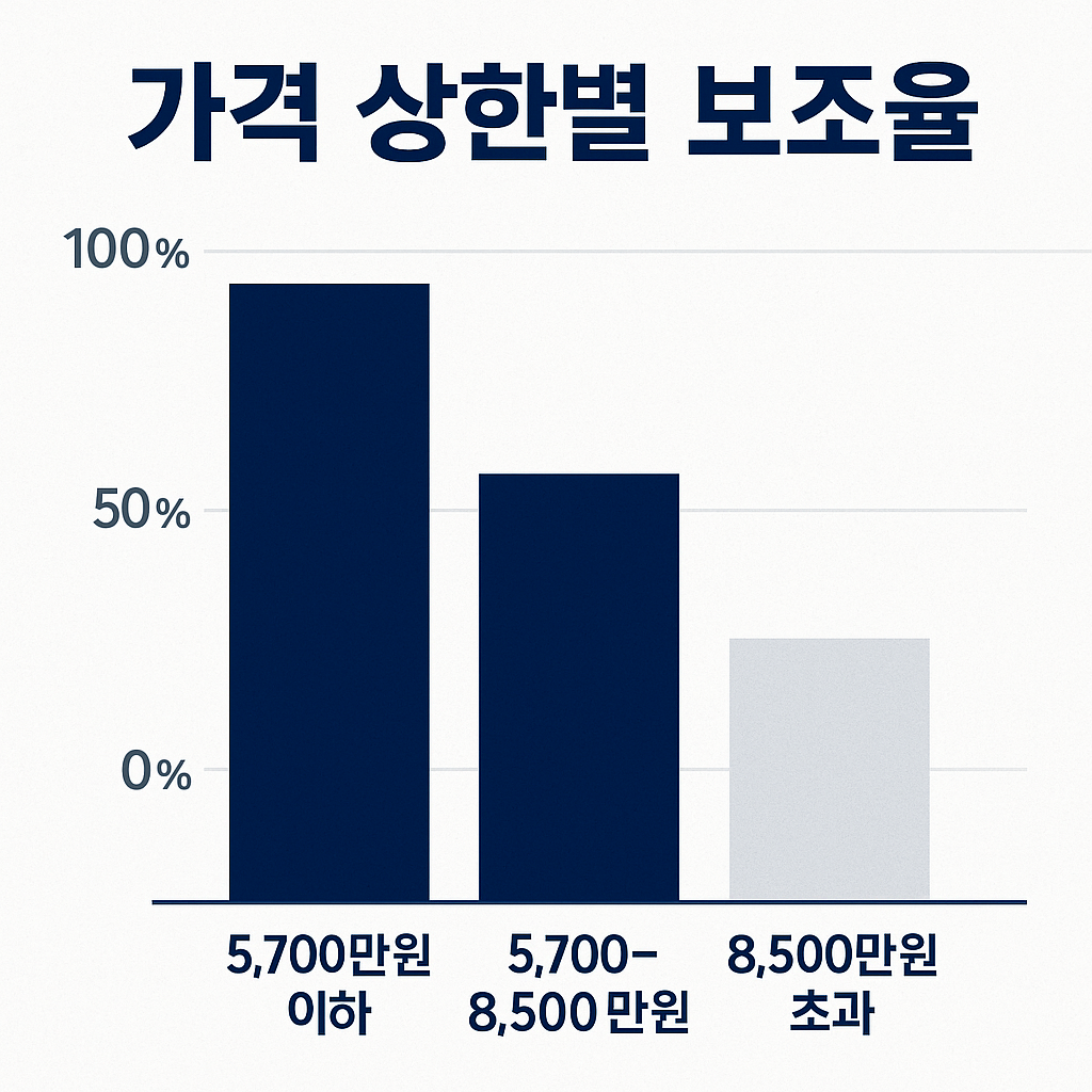 | 가격 상한 | 기본가 5,300만 원 미만 100% / 5,300만~8,500만 원 미만 50% / 8,500만 원 이상 미지원 | 가격계수 강화[1] |